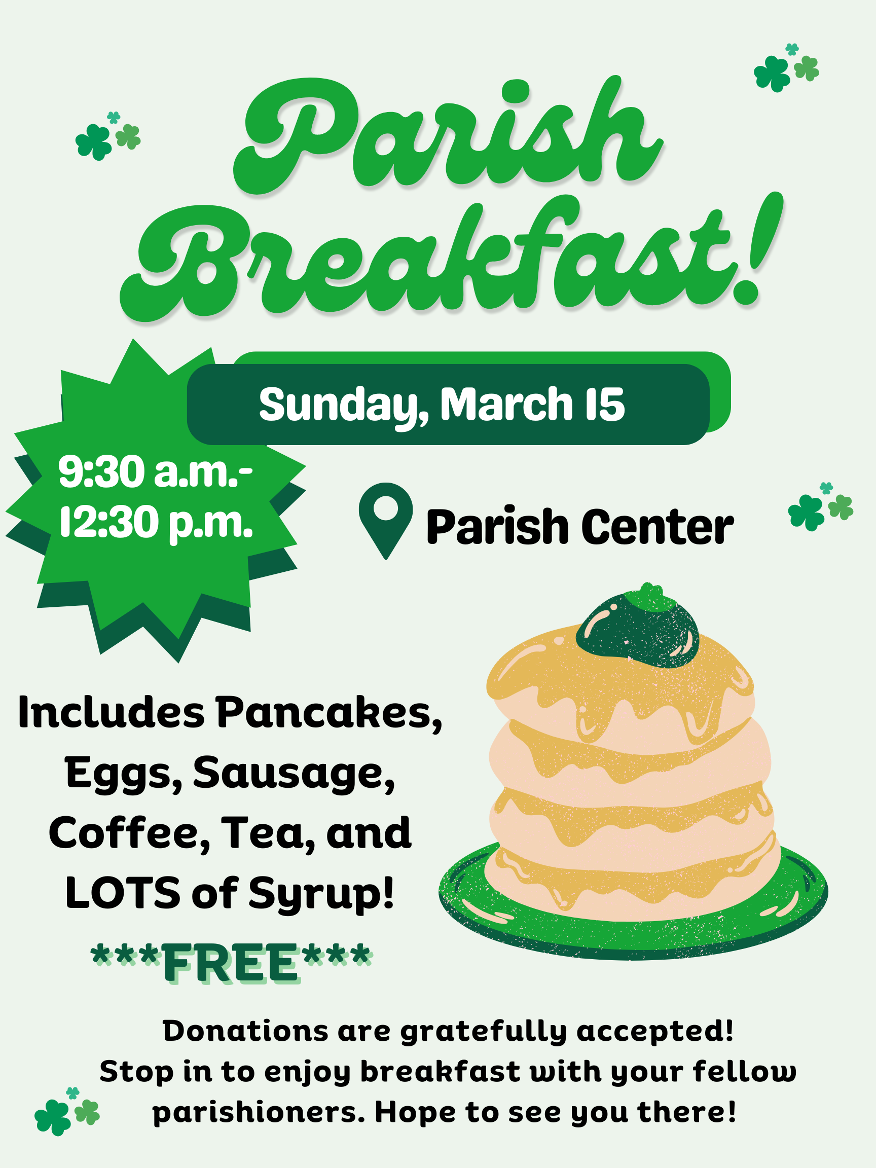 Join us Sunday, March 15th from 9:00 am to 12:30 pm for a special St. Patrick's Day themed Parish Breakfast!