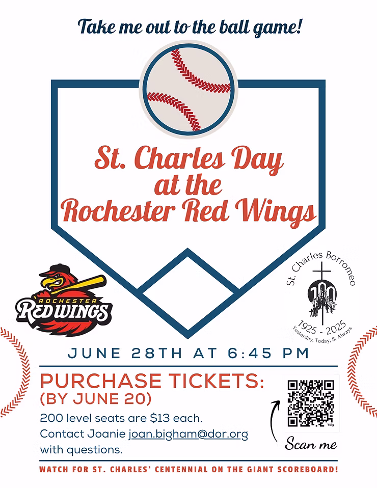 Our Next Centennial Event is the Rochester Red Wings Ball Game on Saturday, June 28 at 6:45 pm. St. Charles will be featured on the Giant Scoreboard during the game!!! The Red Wings take on the Syracuse Mets at Innovative Field. There will be post-game Fireworks too!!! Tickets are $13 each. Purchase your tickets on-line using this link: https://www.ticketreturn.com/prod2new/GroupPortalPEC.asp?HoldID=35073&SponsorID=17608&EventID=346327